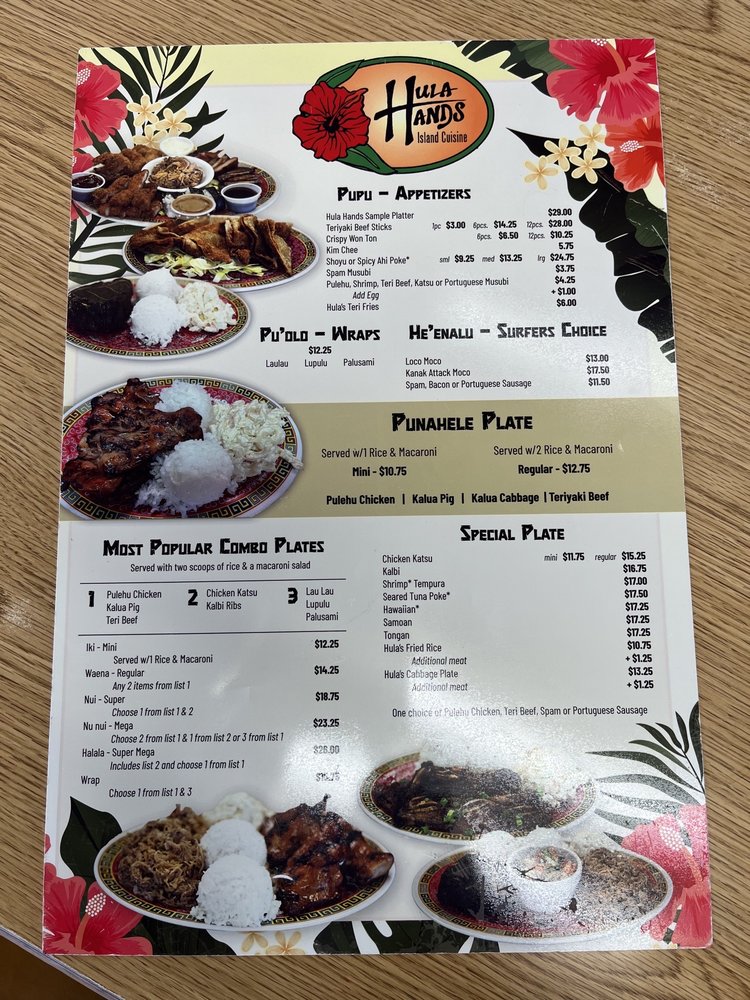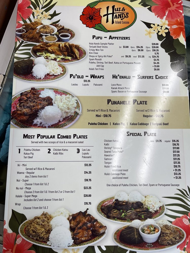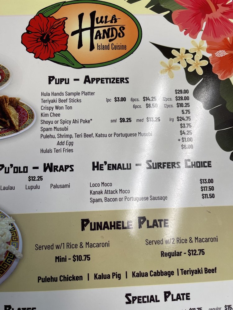 - Appetizers: Start your culinary adventure with the Hula Hands Sample Platter, featuring a delightful mix of kalbi, teri beef, katsu, and more—all for just $25. You can’t go wrong with the Teriyaki Beef Sticks either, priced at $11.75.